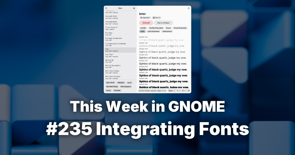 Dan SimmonsA to Linux and Tech NewsEnglish • 2 months agoTWIG #235 Integrating Fontsthisweek.gnome.orgexternal-linkmessage-square0arrow-up14arrow-down10